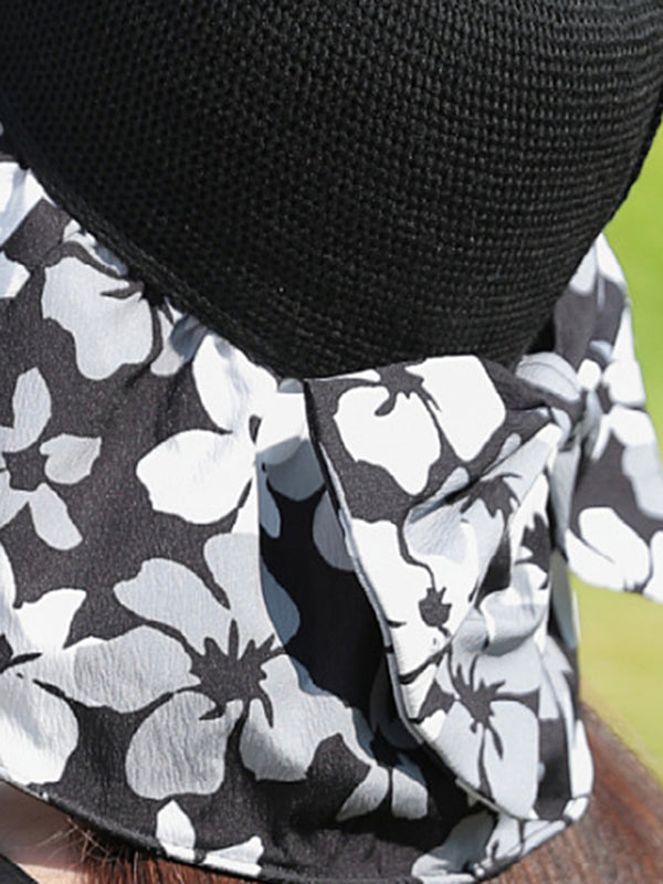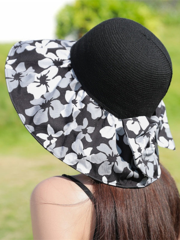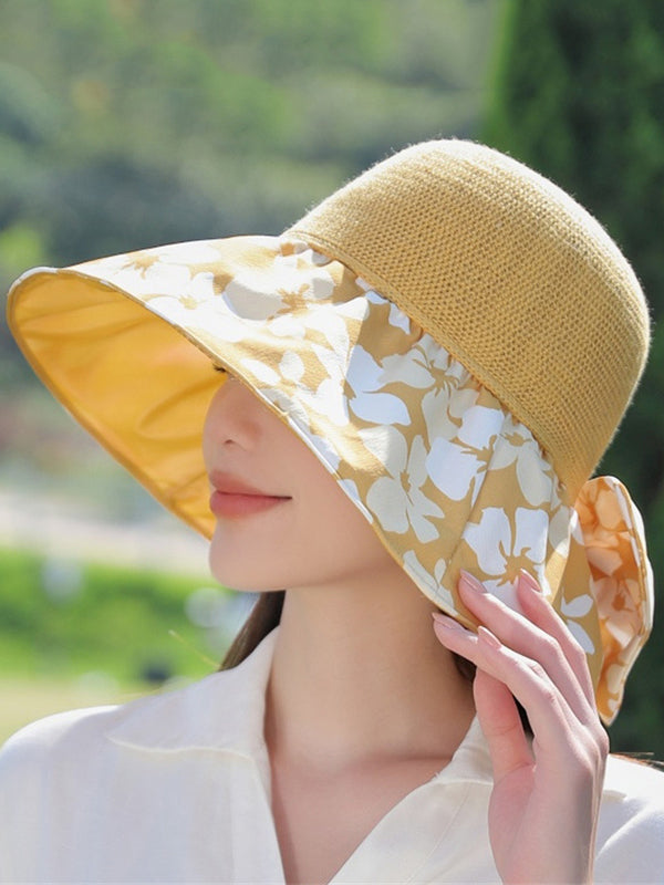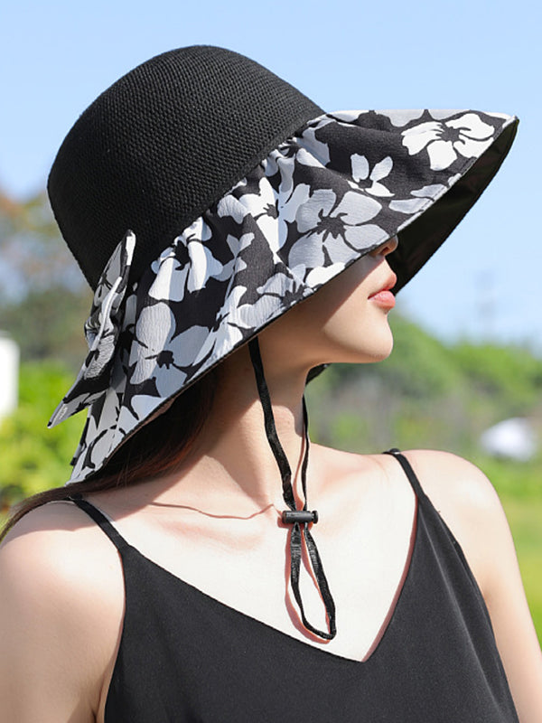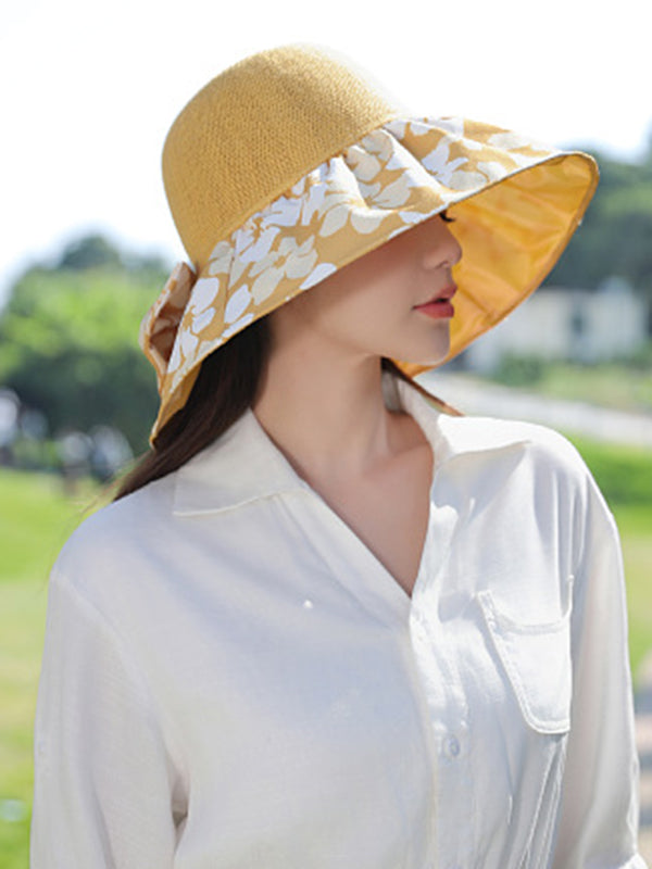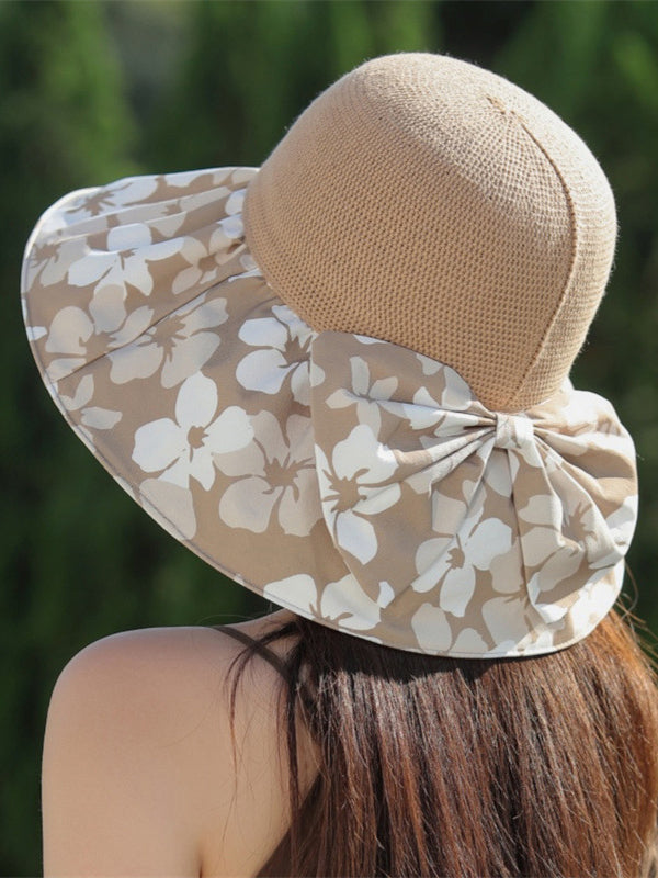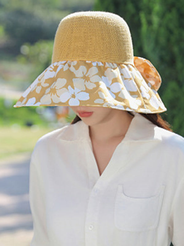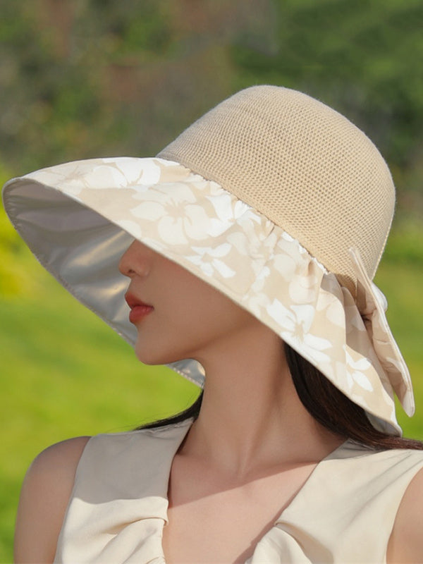 Bowknot Flower Print Pleated Split-Joint Sun Protection Fisherman Hat Sun Hat