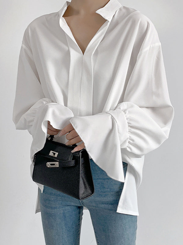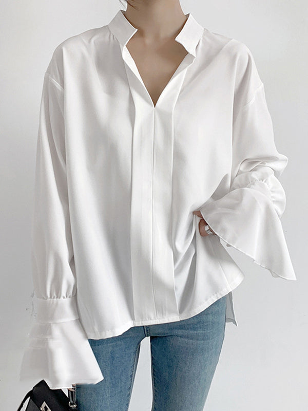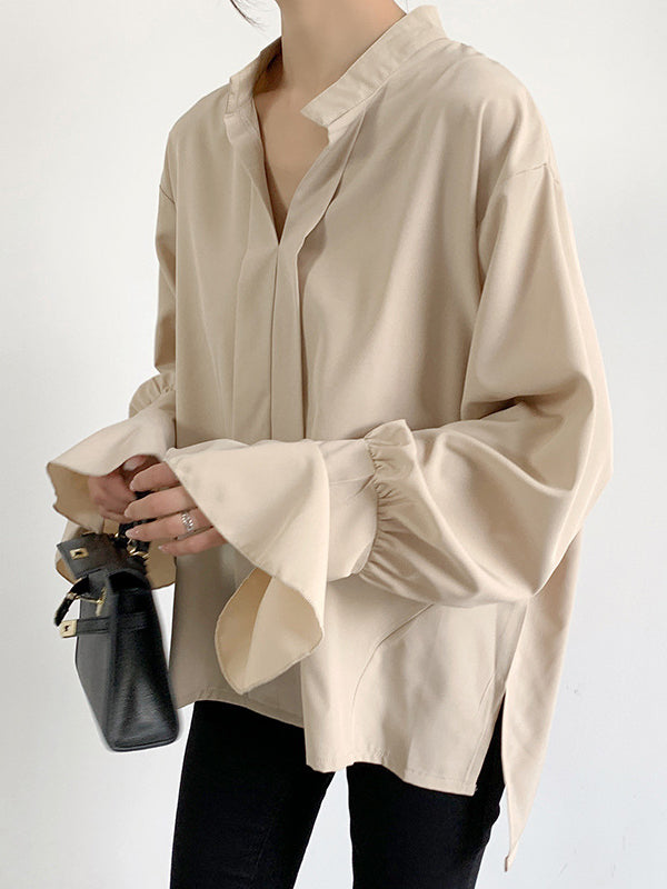 Flared Sleeves High-Low Buttoned Solid Color Split-Side V-Neck Blouses&Shirts Tops