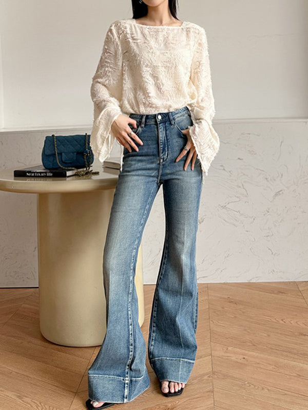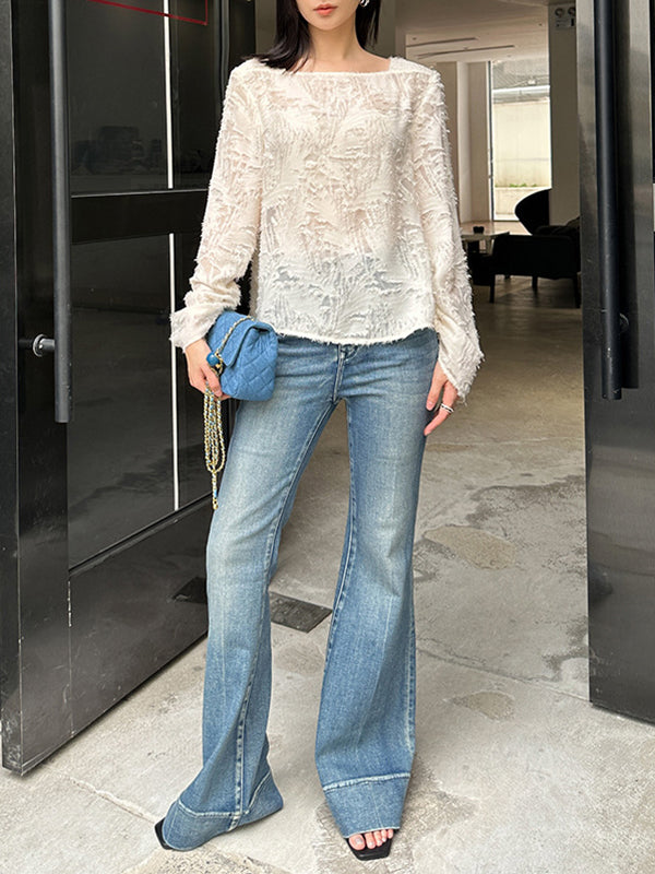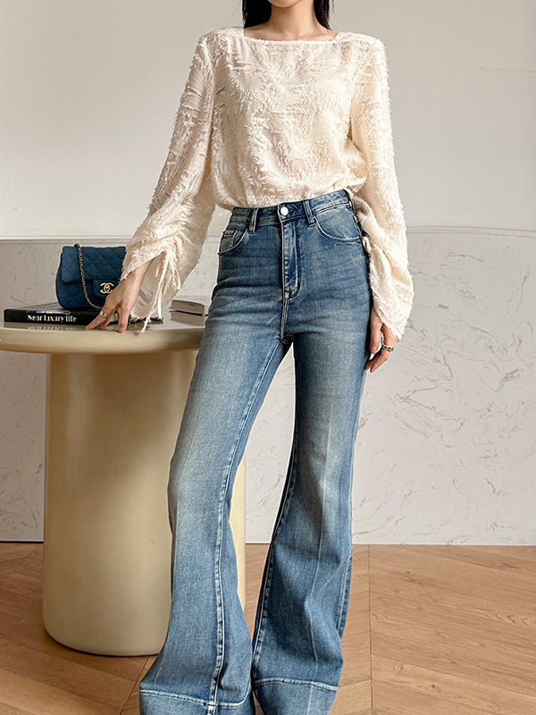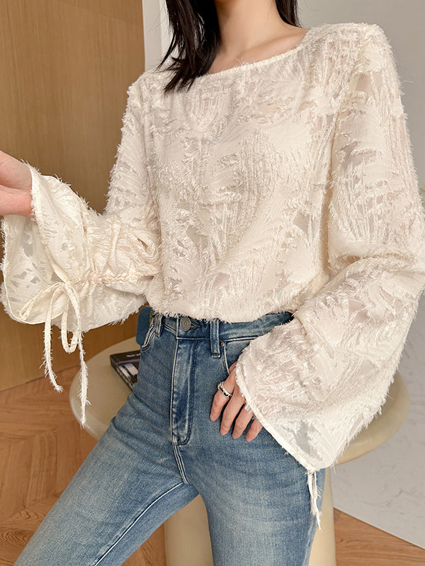 Flared Sleeves Long Sleeves Drawstring Fringed Solid Color Square-Neck Blouses&Shirts Tops