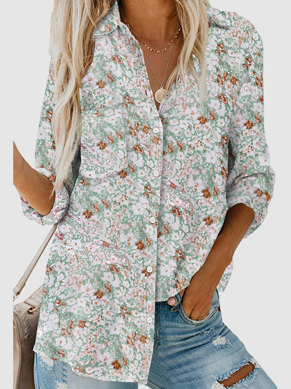 High-Low Long Sleeves Buttoned Flower Print Pockets Lapel Blouses&Shirts Tops