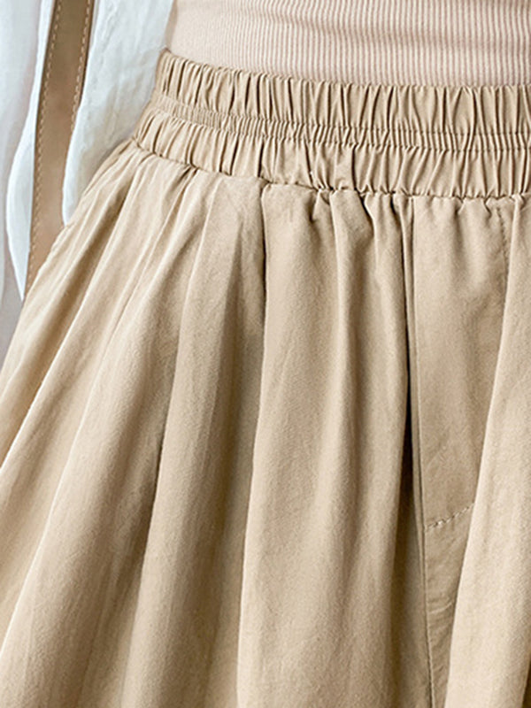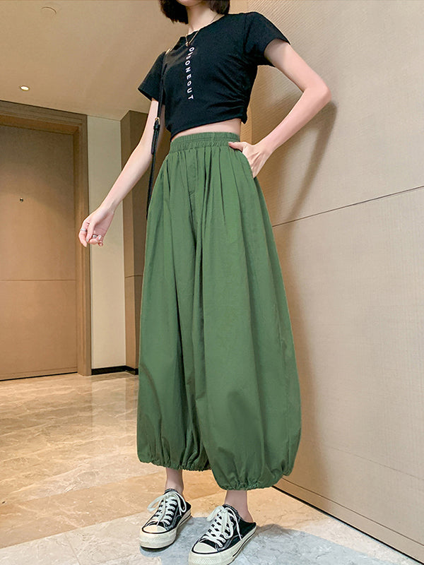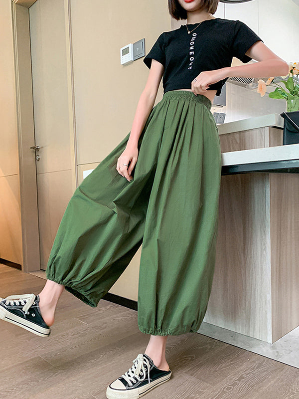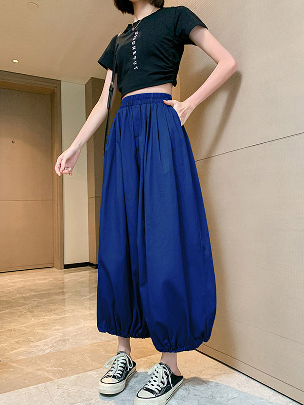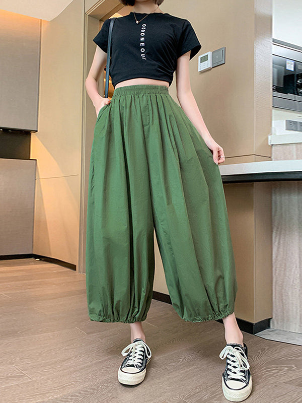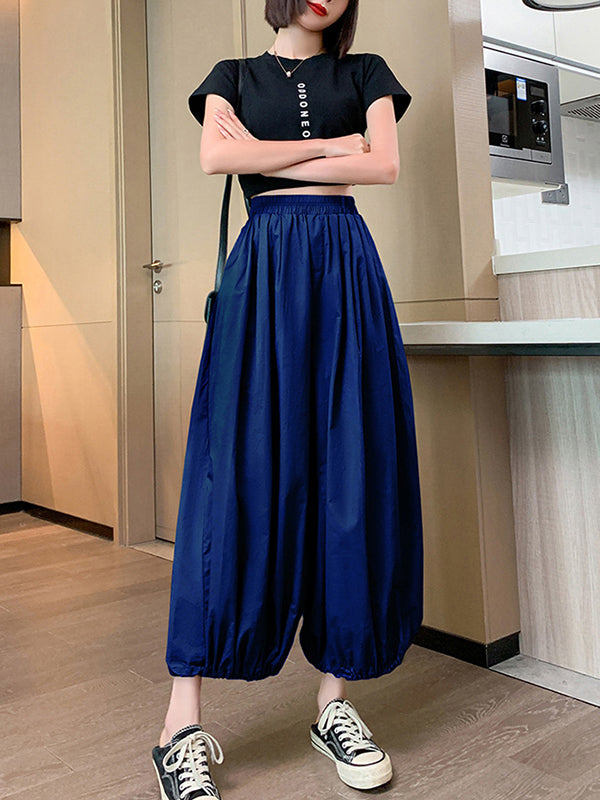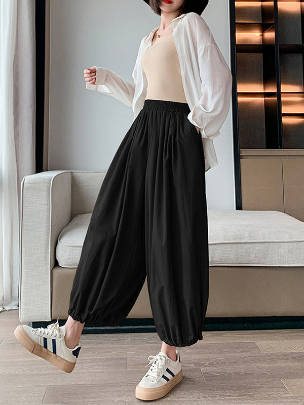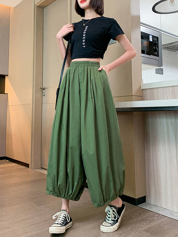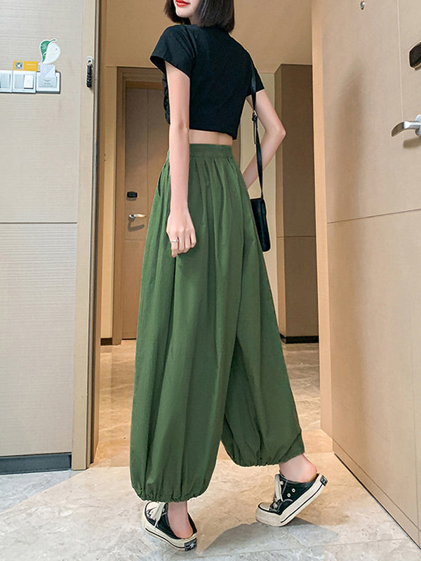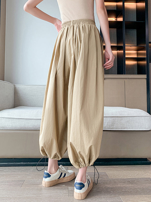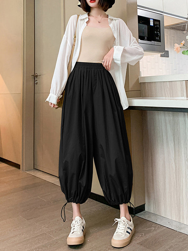 High Waisted Loose Drawstring Elasticity Pleated Solid Color Split-Joint Knickerbockers Ninth Pants Pants Trousers