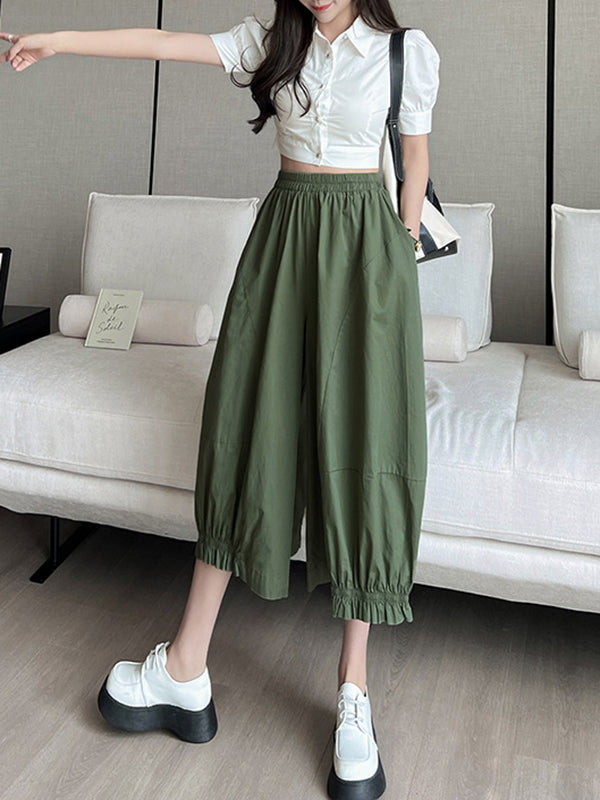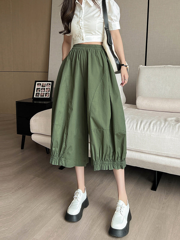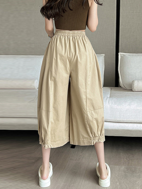 High Waisted Loose Elasticity Solid Color Split-Joint Knickerbockers Ninth Pants Pants Trousers