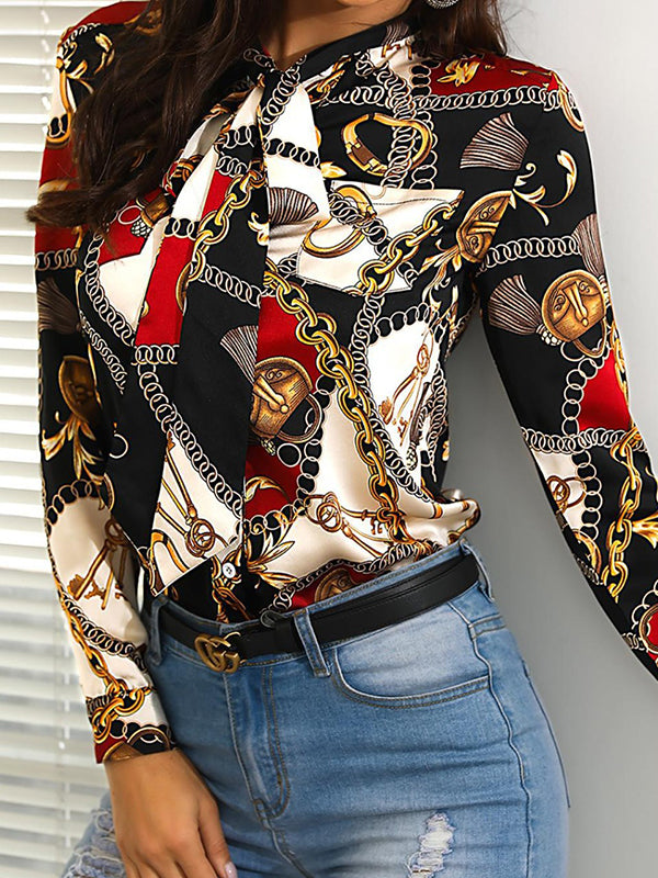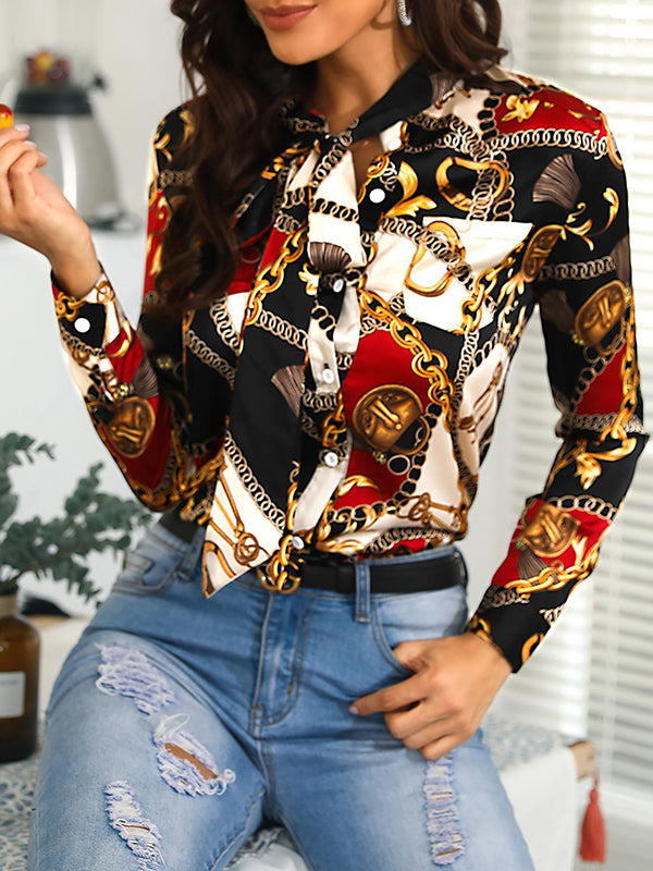 Long Sleeves Loose Buttoned Printed Tied Mock Neck Blouses&Shirts Tops