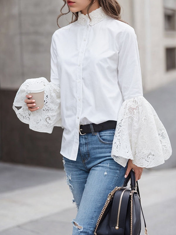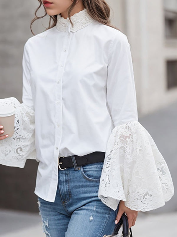 Long Sleeves Loose Buttoned Solid Color Split-Joint Mock Neck Blouses&Shirts Tops