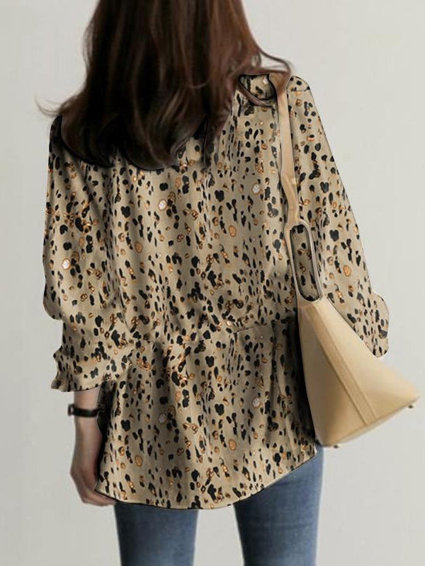 Long Sleeves Loose Drawstring Elasticity Leopard Tied V-Neck Blouses&Shirts Tops