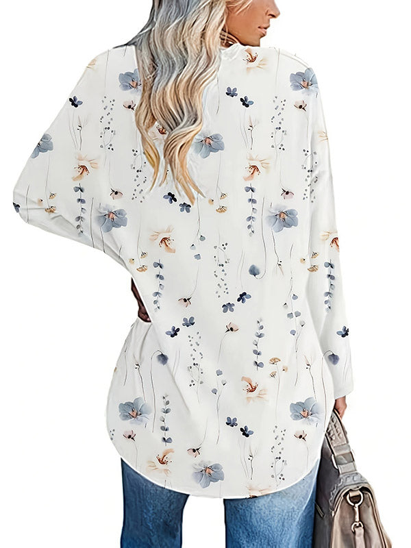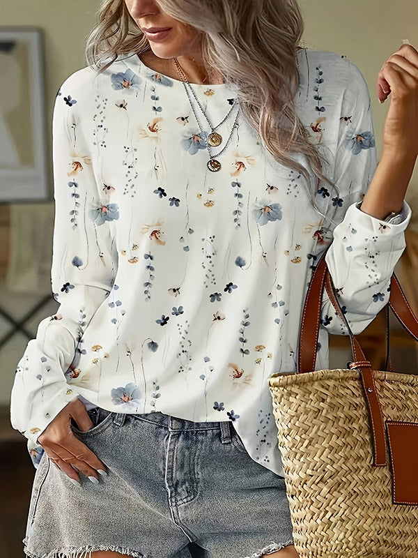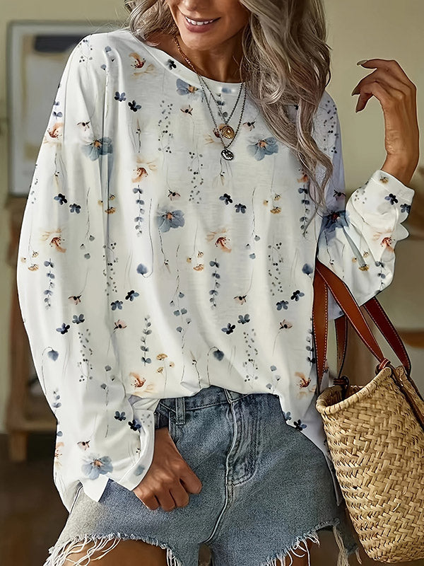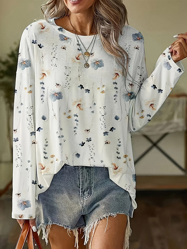 Long Sleeves Loose Flower Print Round-Neck T-Shirts Tops