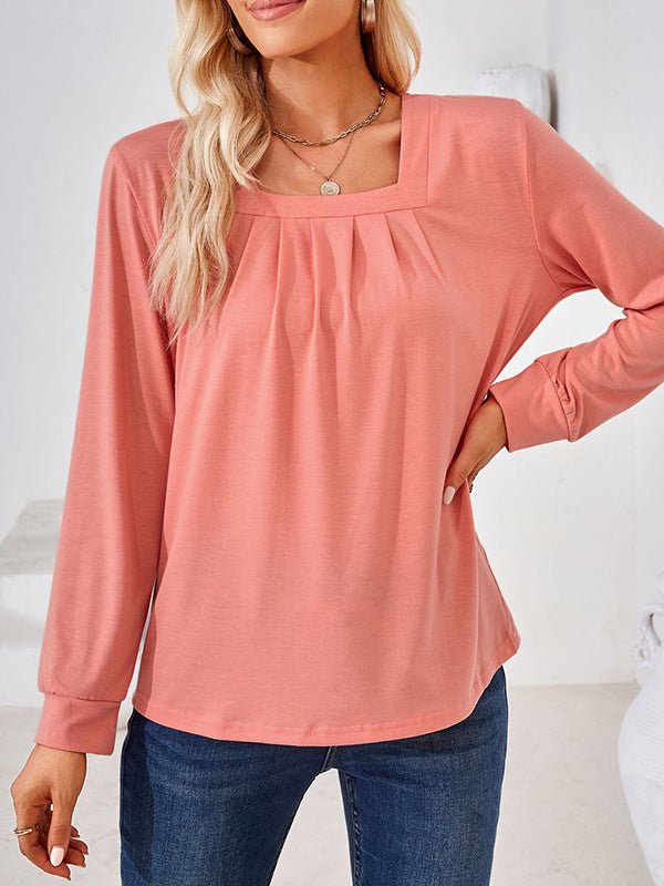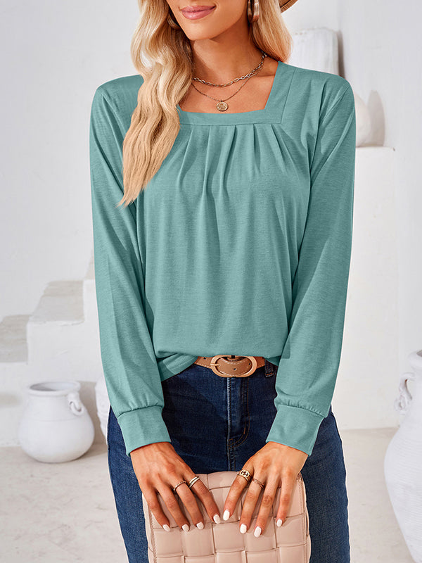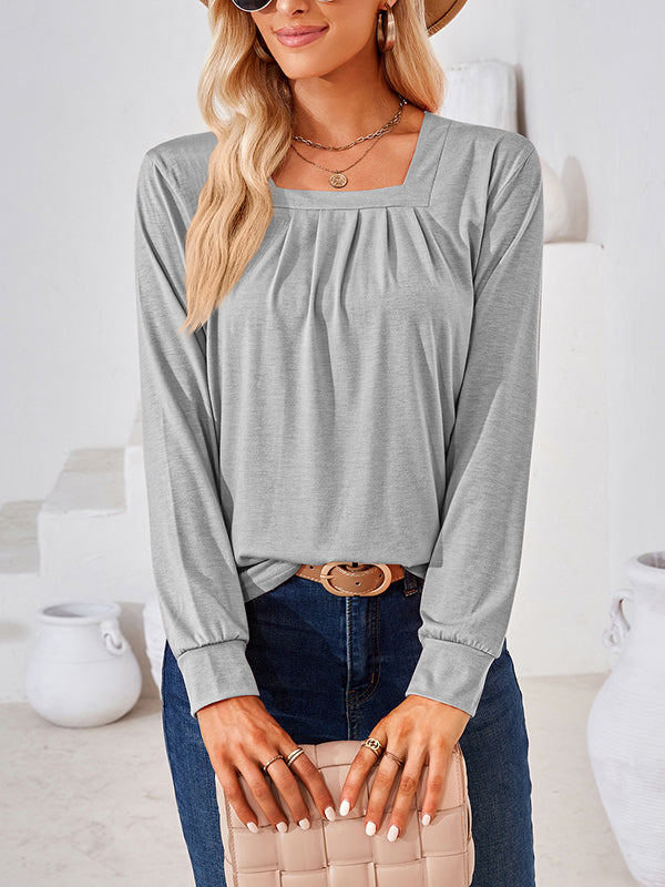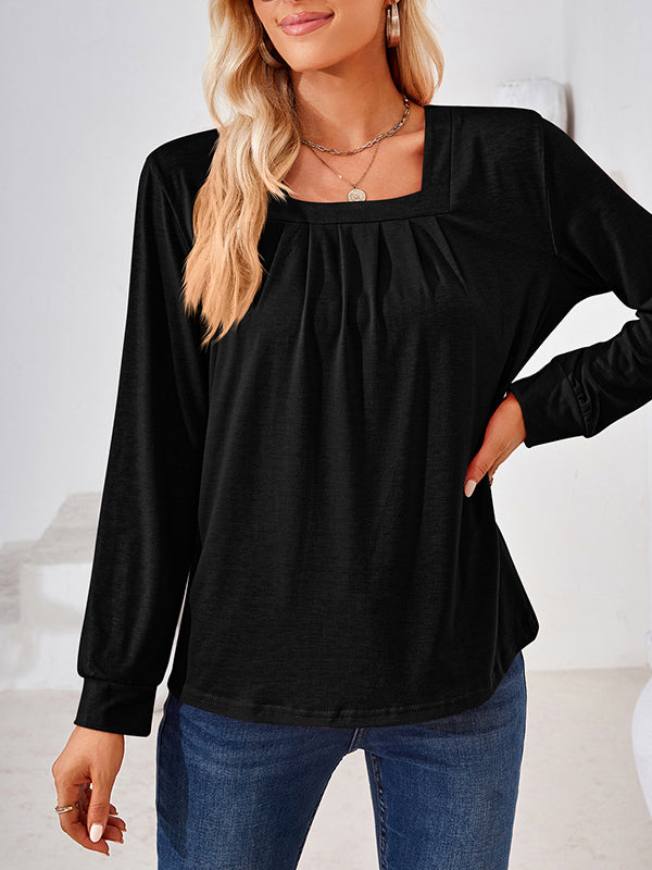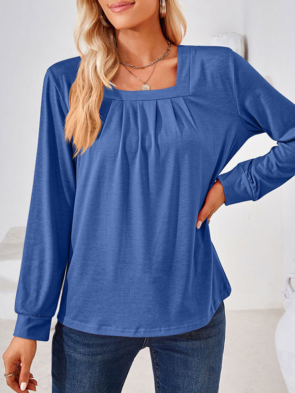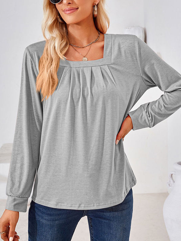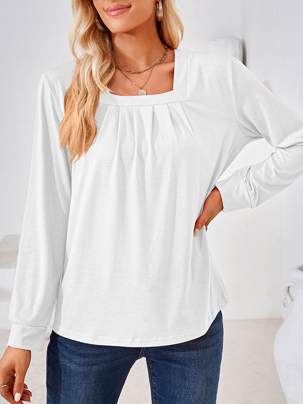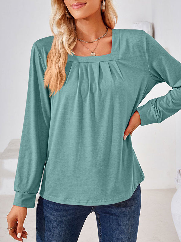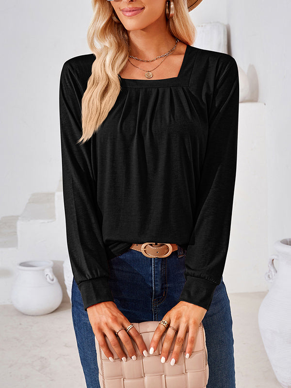 Long Sleeves Loose Pleated Solid Color Square-Neck T-Shirts Tops