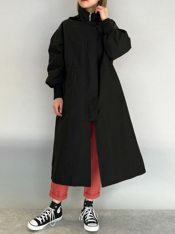 Loose Long Sleeves Drawstring Solid Color Zipper Hooded Trench Coats Outerwear