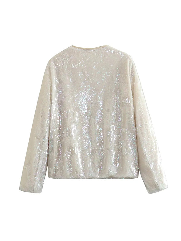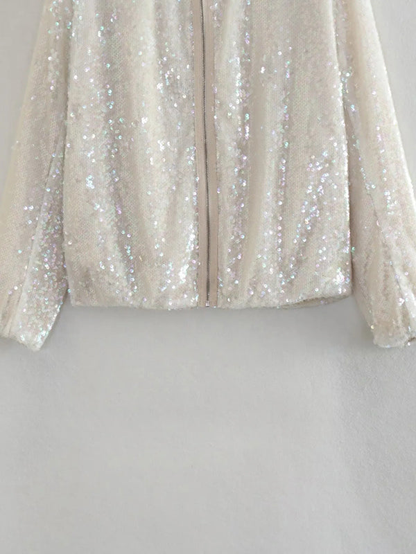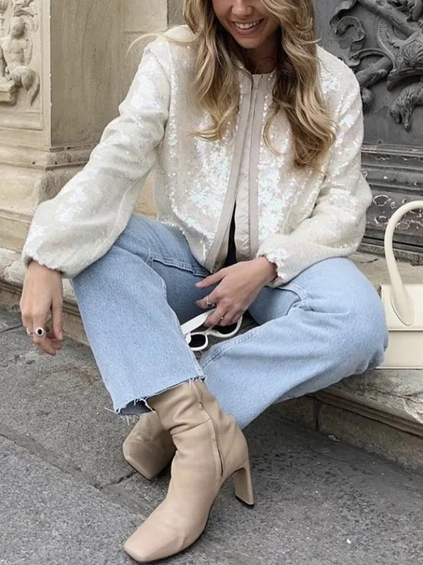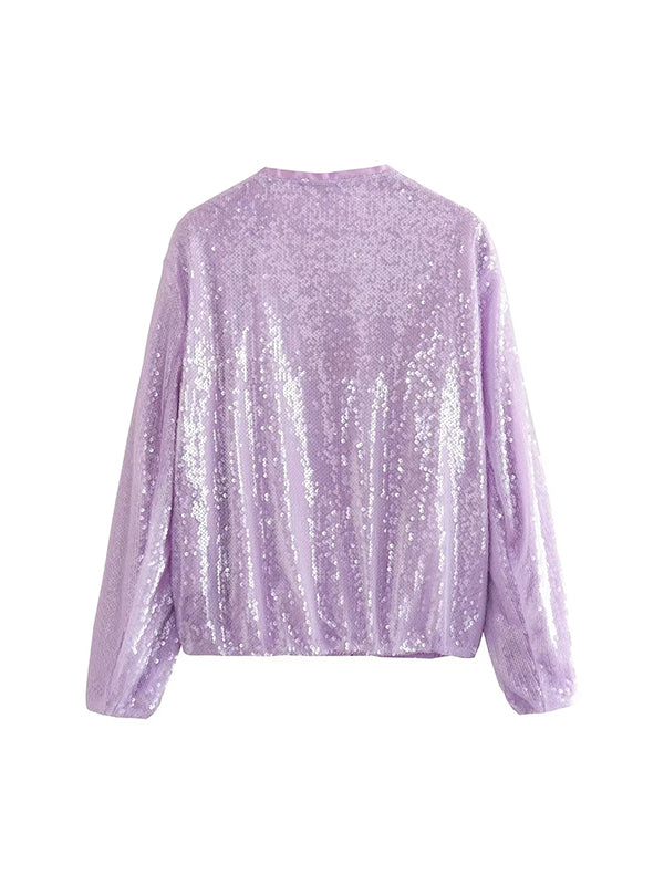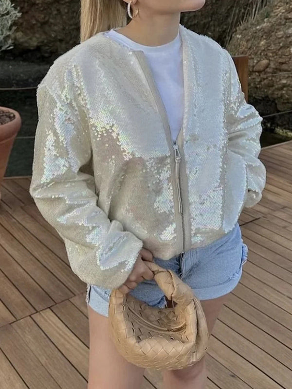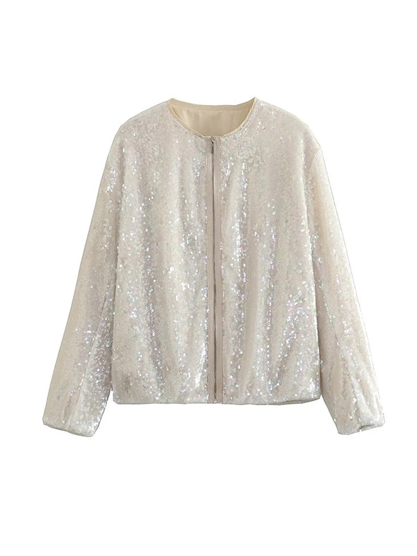 Loose Puff Sleeves Sequined Zipper Round-Neck Jackets Outerwear