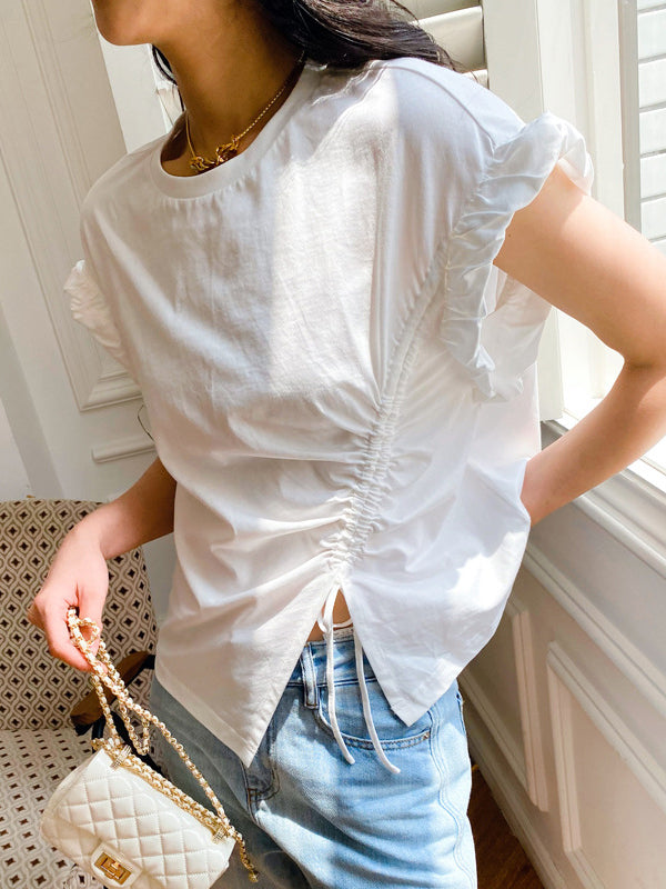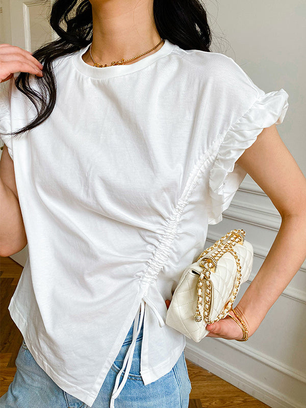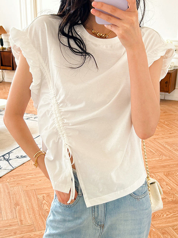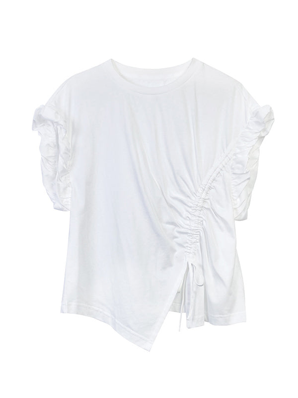 Loose Short Sleeves Asymmetric Drawstring Pleated Ruffle Trim Solid Color Split-Front Round-Neck T-Shirts Tops