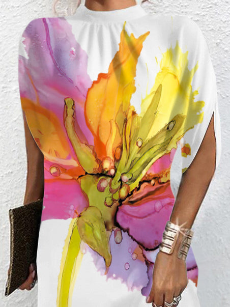 Loose Sleeveless Contrast Color Flower Print Stand Collar Mini Dresses
