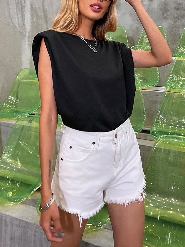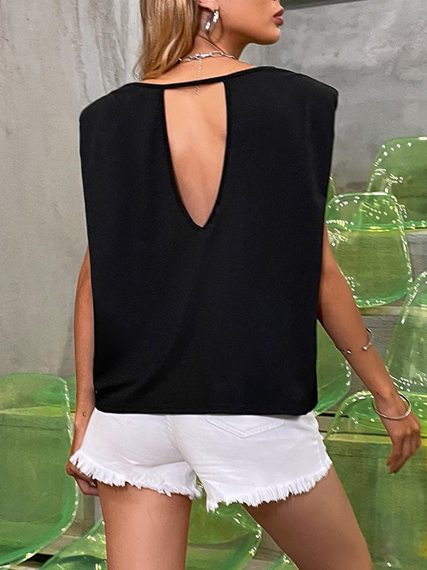 Loose Sleeveless Hollow Shoulder Pad Solid Color Round-Neck T-Shirts Tops