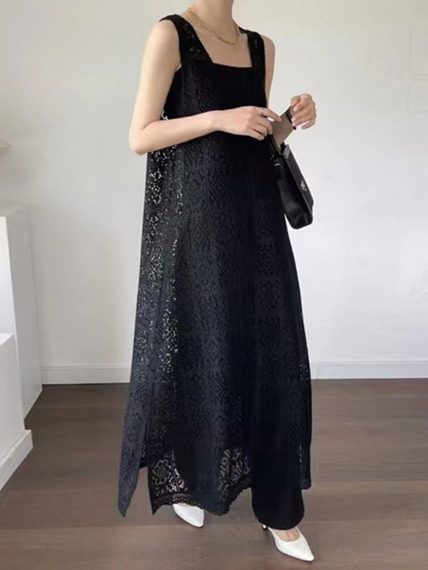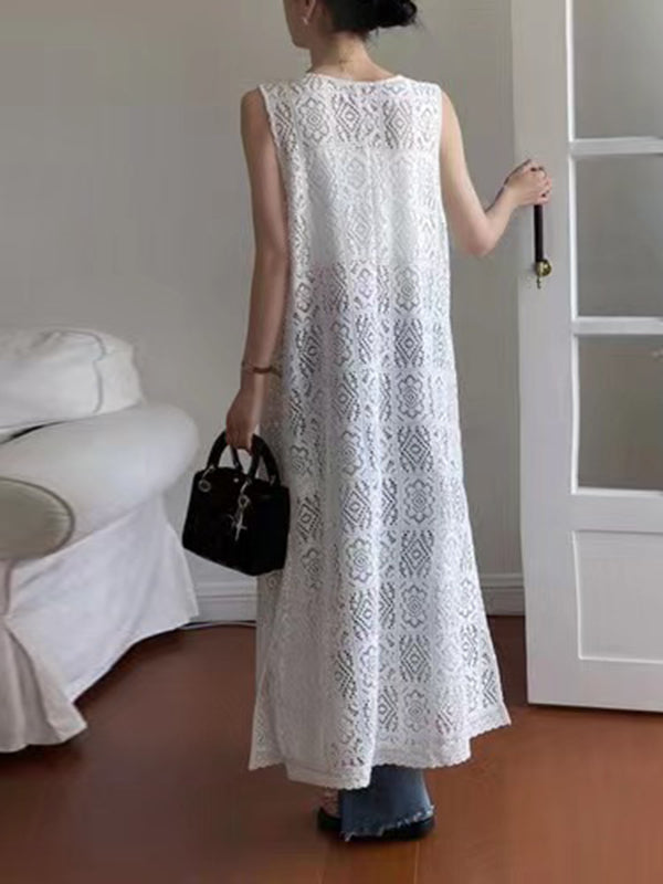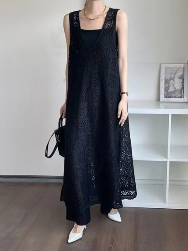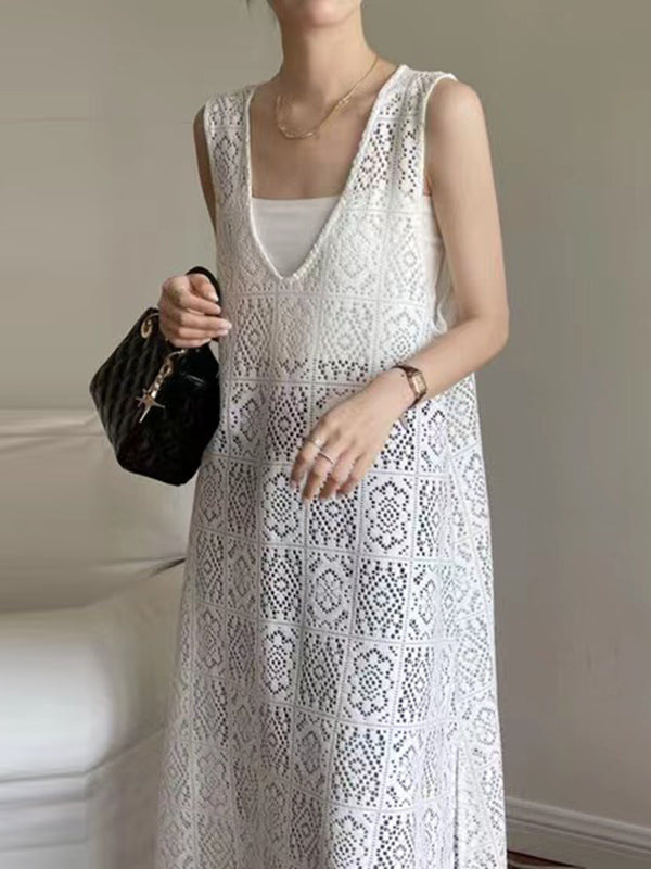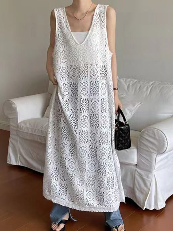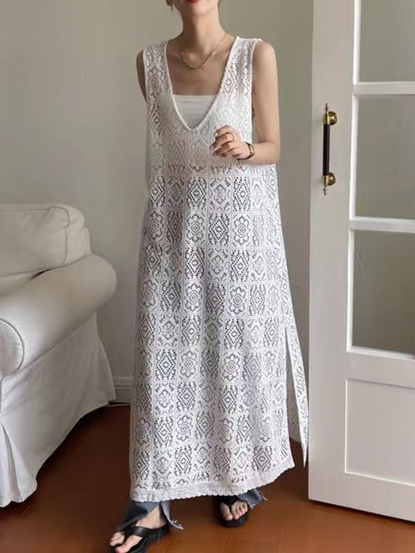 Loose Sleeveless Hollow Solid Color Split-Joint Split-Side V-Neck Maxi Dresses