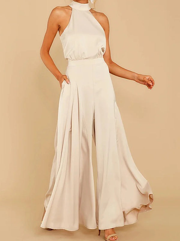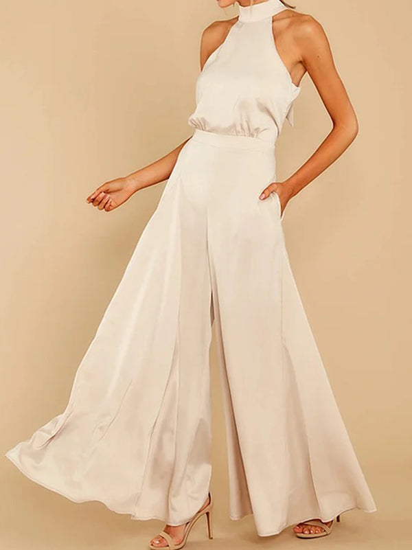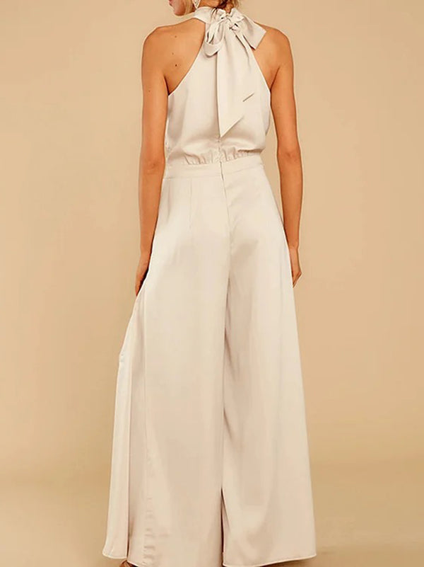 Loose Sleeveless Pockets Solid Color Tied Zipper Halter-Neck Jumpsuits