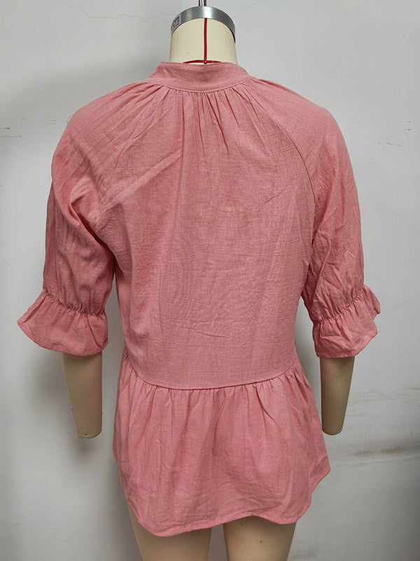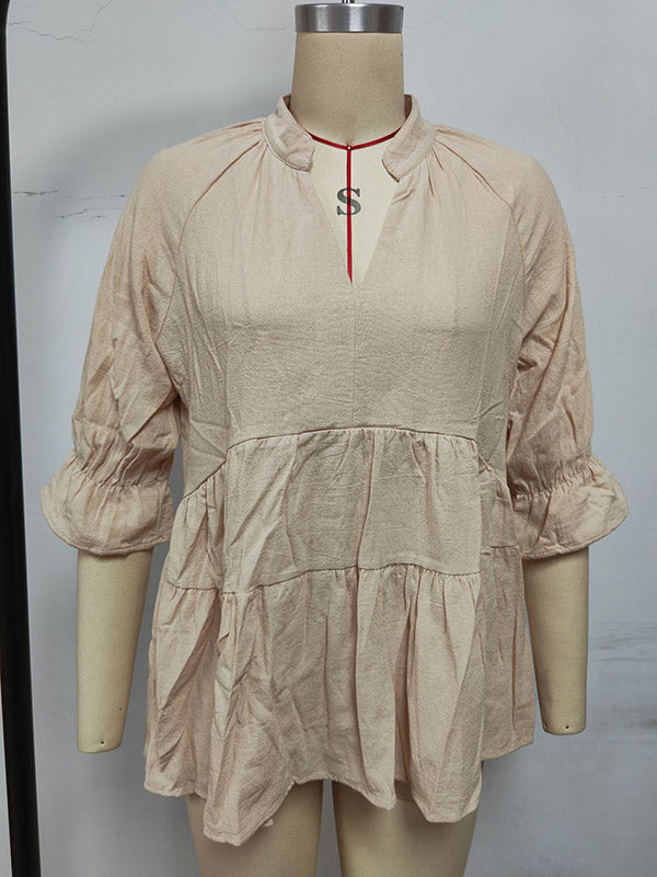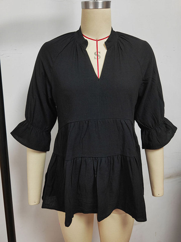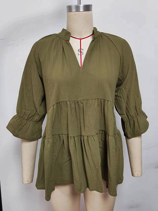 Loose Three-Quarter Sleeves Elasticity Pleated Solid Color Split-Joint V-Neck T-Shirts Tops