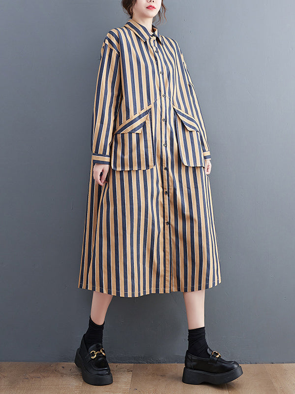 Original Loose Long Sleeves Buttoned Striped Lapel Collar Midi Shirt Dresses
