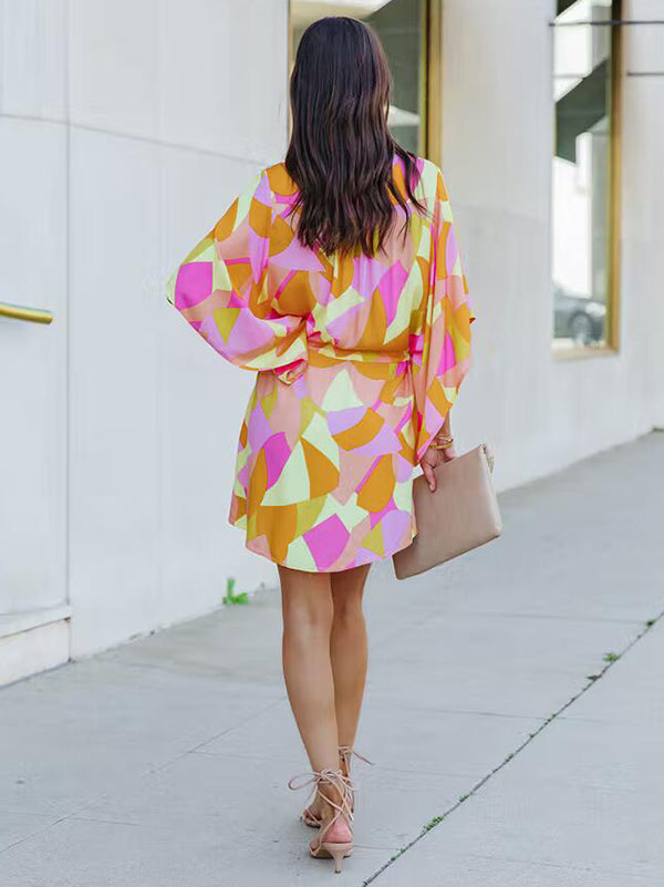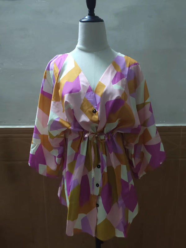 Original Loose Printed Contrast Color Tied Buttoned Mini Shirt Dress
