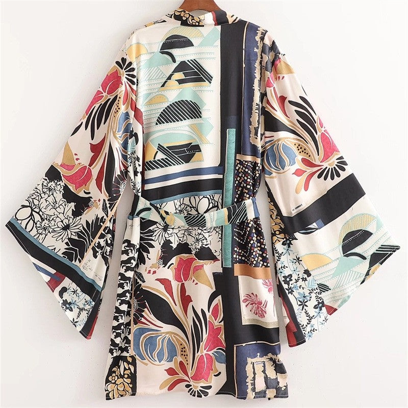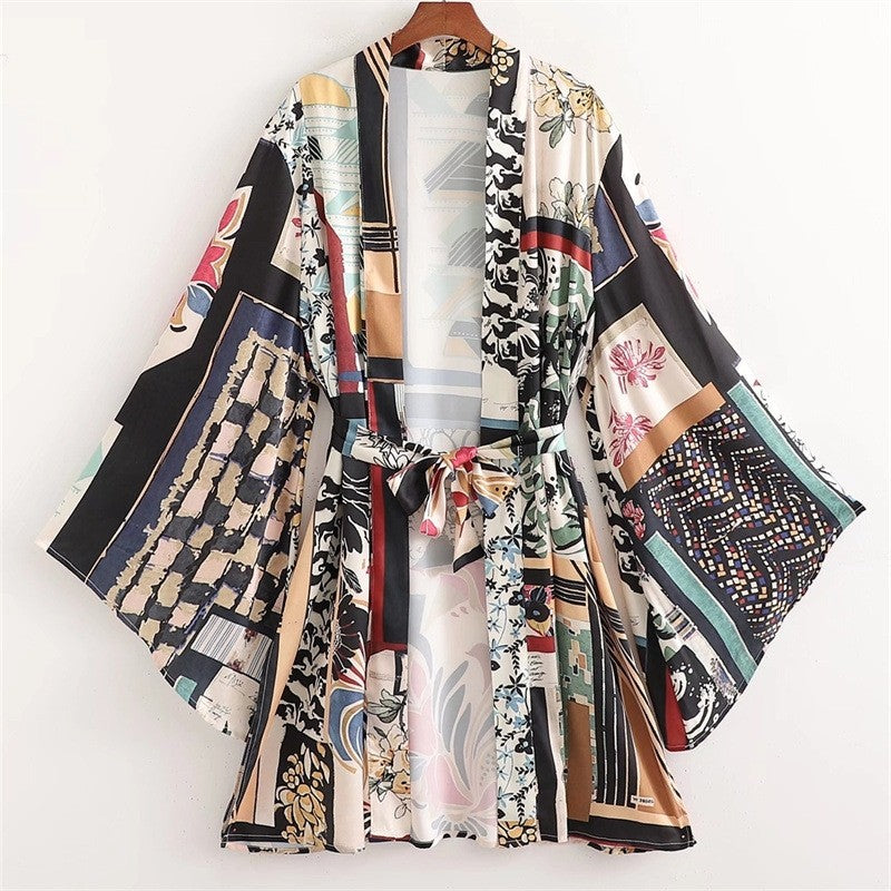 Printed Patchwork Kimono Top And Wide Leg Pants Set