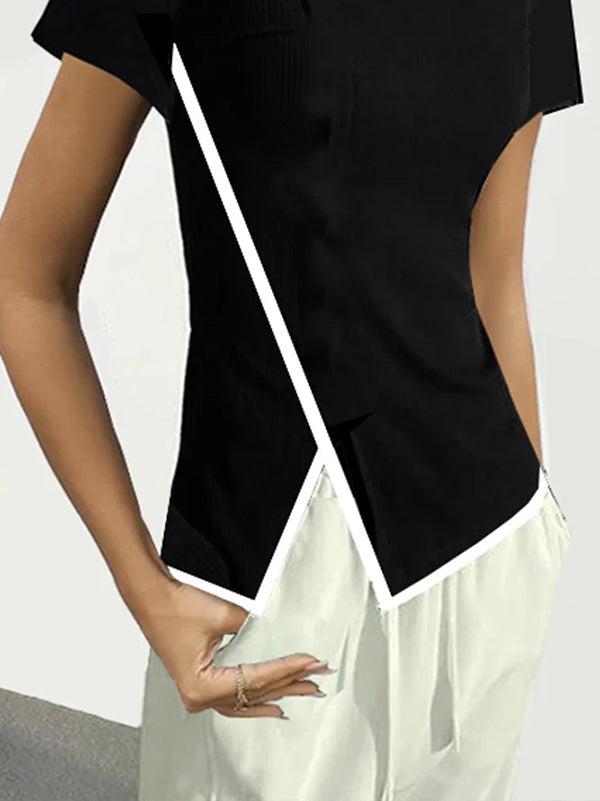 Short Sleeves Skinny Asymmetric Contrast Color Split-Front Round-Neck T-Shirts Tops
