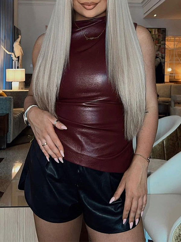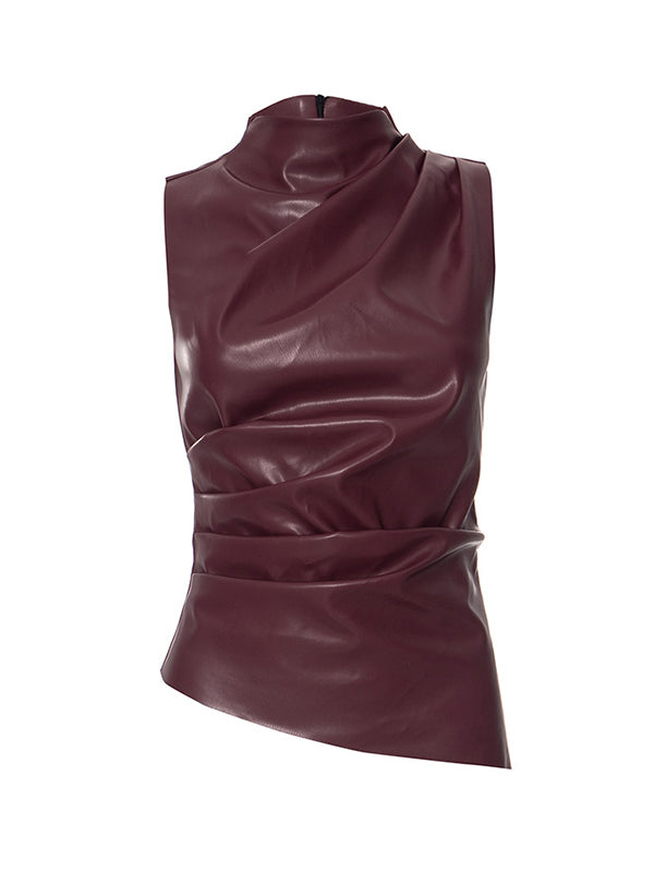 Skinny Sleeveless Asymmetric Pleated Solid Color Mock Neck Vest Top