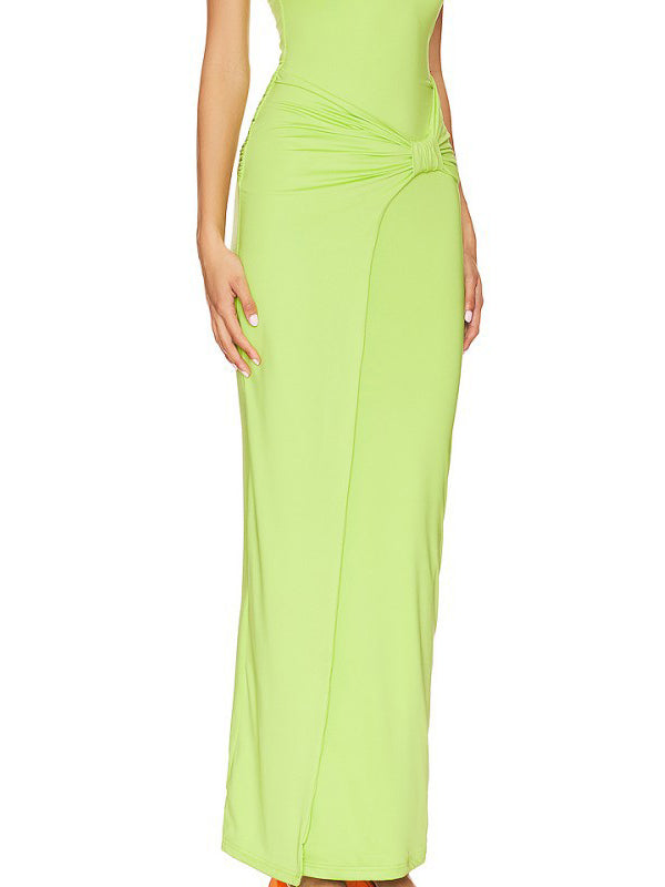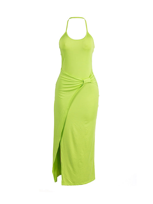 Skinny Sleeveless Backless Pleated Solid Color Split-Joint Split-Side Halter-Neck Maxi Dresses