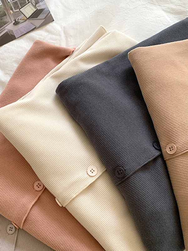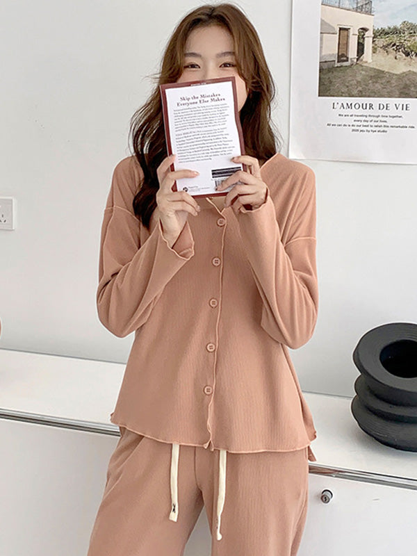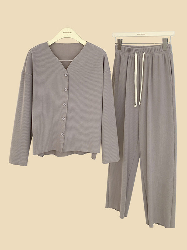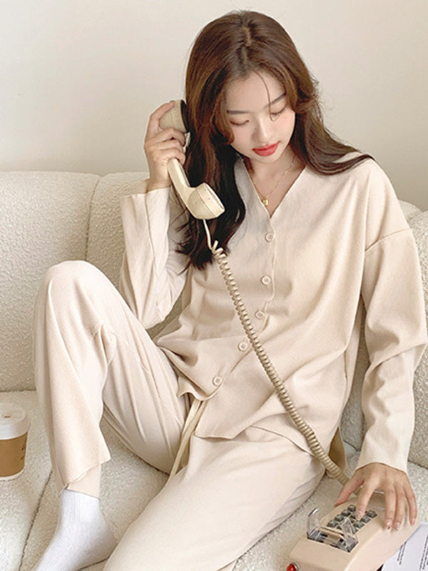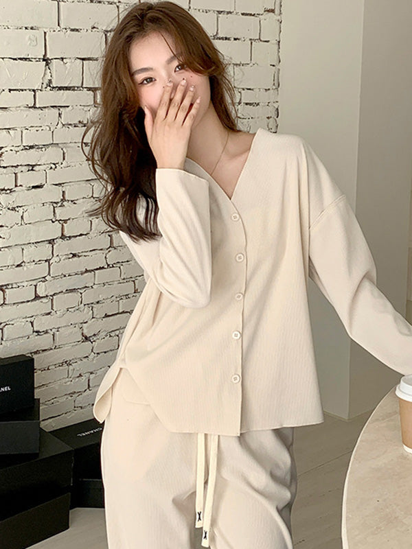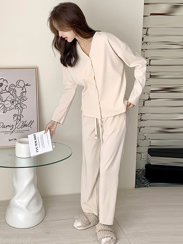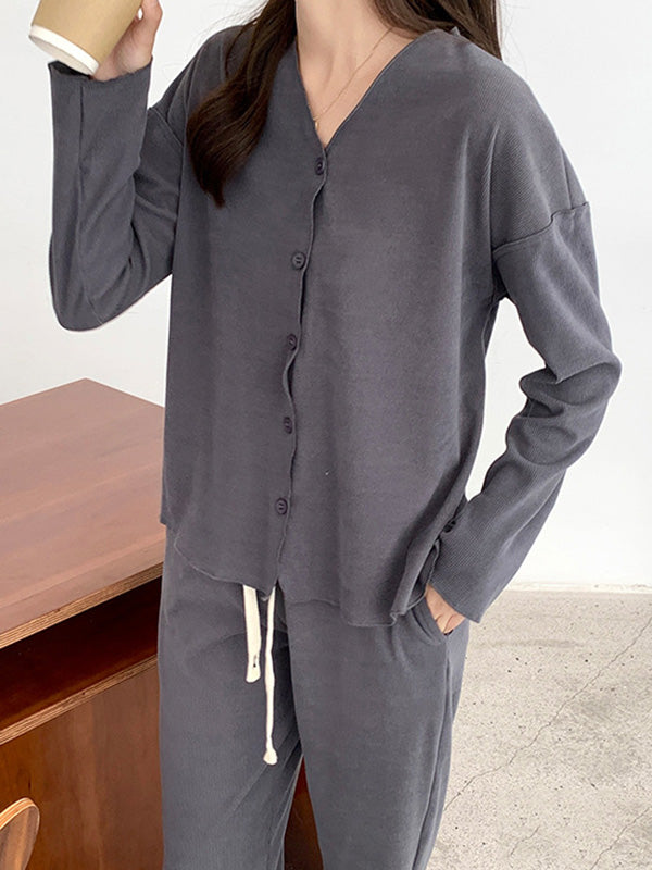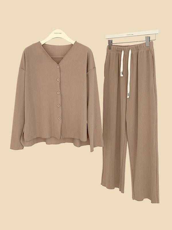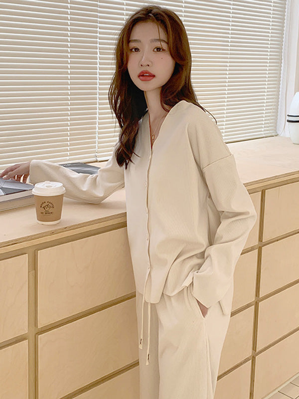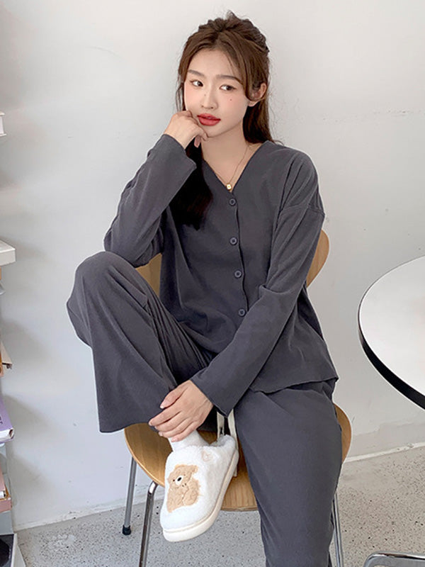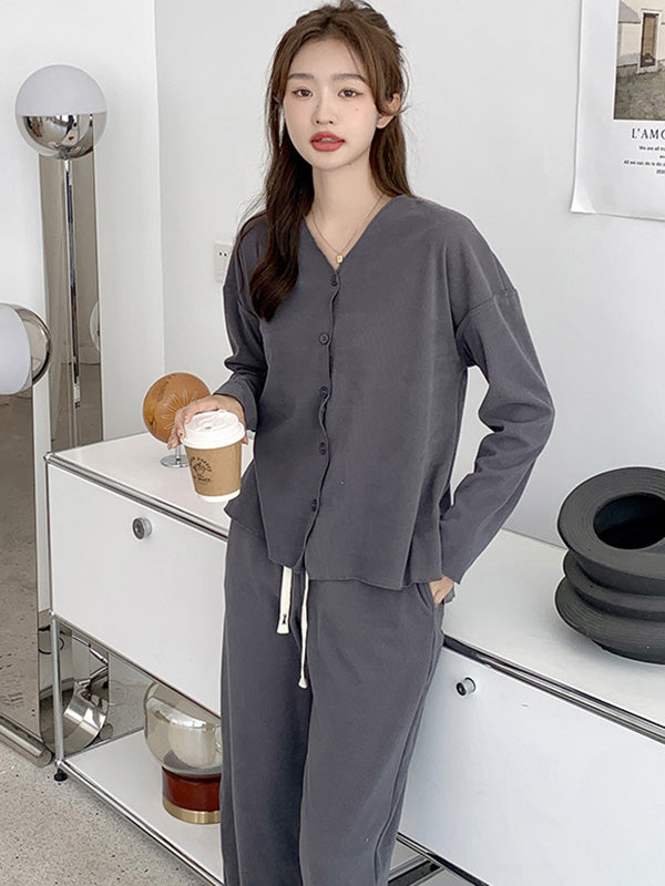 Solid Color Long Sleeves V-Neck Cardigan Tops & Pants Pajamas Set