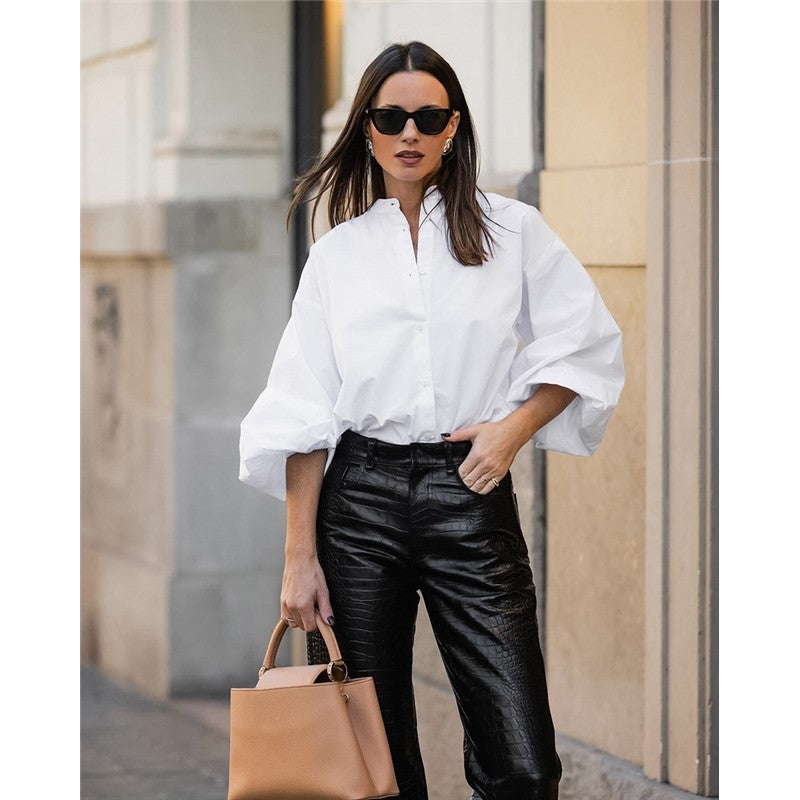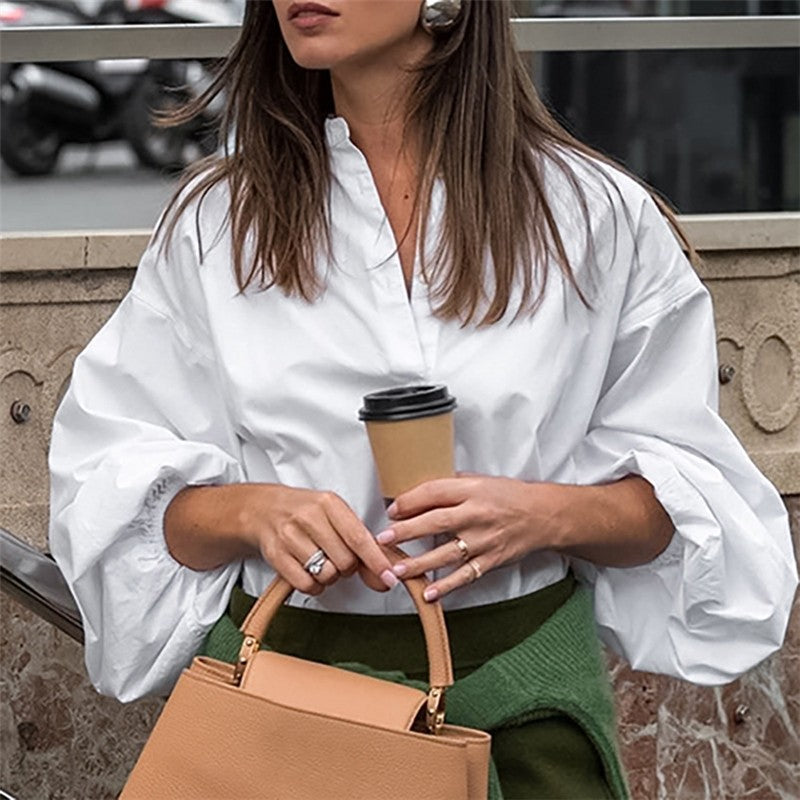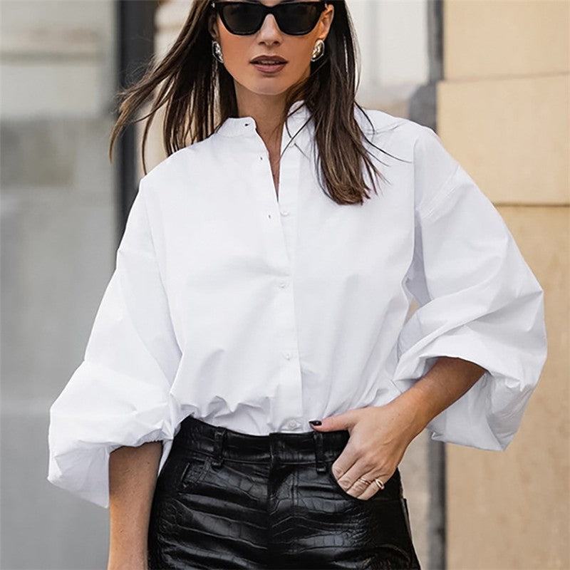 Stylish Commute Shirt with Minimalist Design, Stand Collar, Lantern Sleeves, and Pure Cotton Fabric